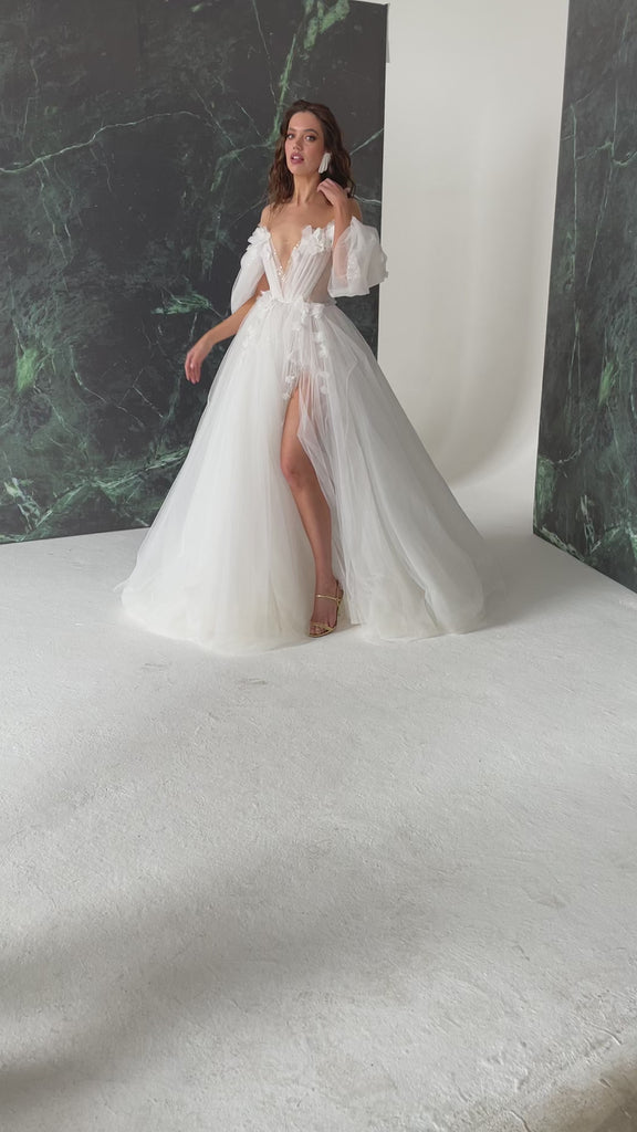 A poofy white dress with slit and a small train. The dress is decorated with flowers and beads. Please note that you can order a head piece, gloves and/or a veil for your dress separately.